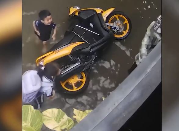 Video: Leo lên xe giữa đường ngập, chị gái khiến em trai "uống no nước"